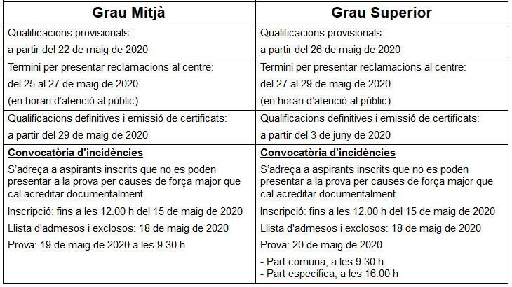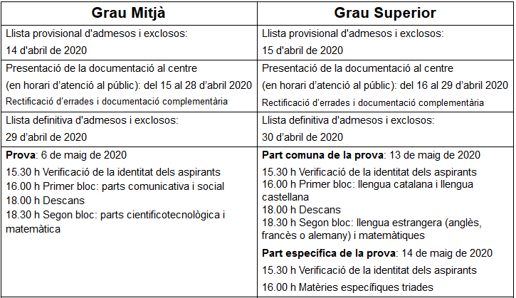 Inscripció: del 16 de març (a partir de les 9.00 h) fins al 26 de març de 2020 (a les 23.59 h) mitjançant l’aplicació informàtica disponible a la pàgina web del Departament d’Educació.