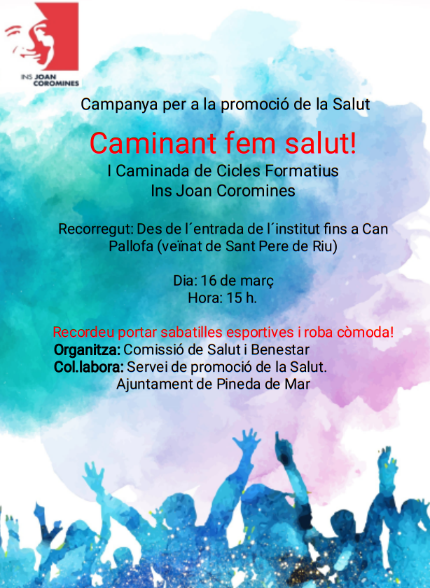 La Comissió de #Salut i #Benestar organitza una #caminada amb l’alumnat de Cicles Formatius per fomentar l’activitat física. La sortida està prevista el dilluns 16 de març a les 15:30h des de l’Institut fins Can Pallofa, al Veïnat de Sant Pere de Rius. L’Ajuntament de Pineda col·labora oferint avituallament per tot l’alumnat.