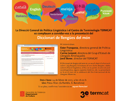 El proper dissabte 21 de febrer se celebra el Dia Internacional de la Llengua Materna. Coincidint amb aquesta efemèride, es presentarà el llibre Diccionari de llengües del món al Palau Marc de Barcelona a partir de les 18:00 hores, presentat per la Direcció General de Política Lingüística i el Centre de Terminologia TERMCAT.