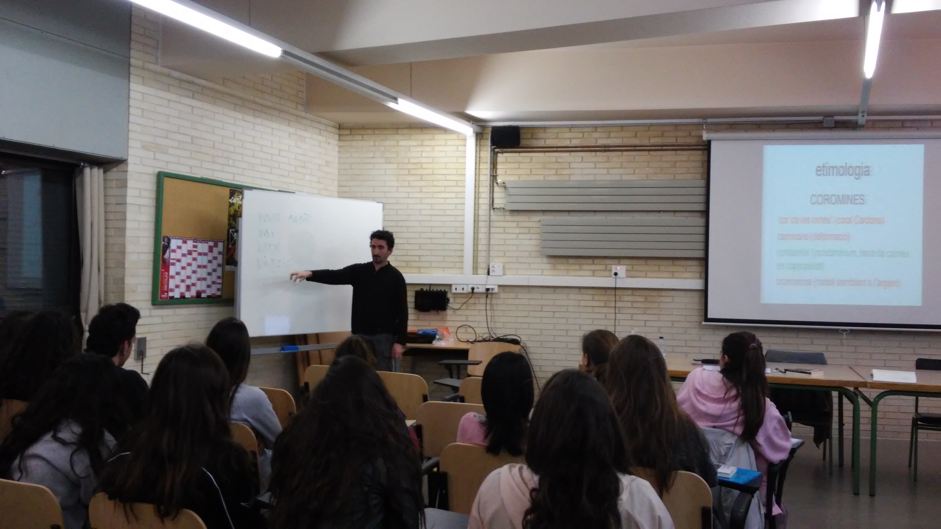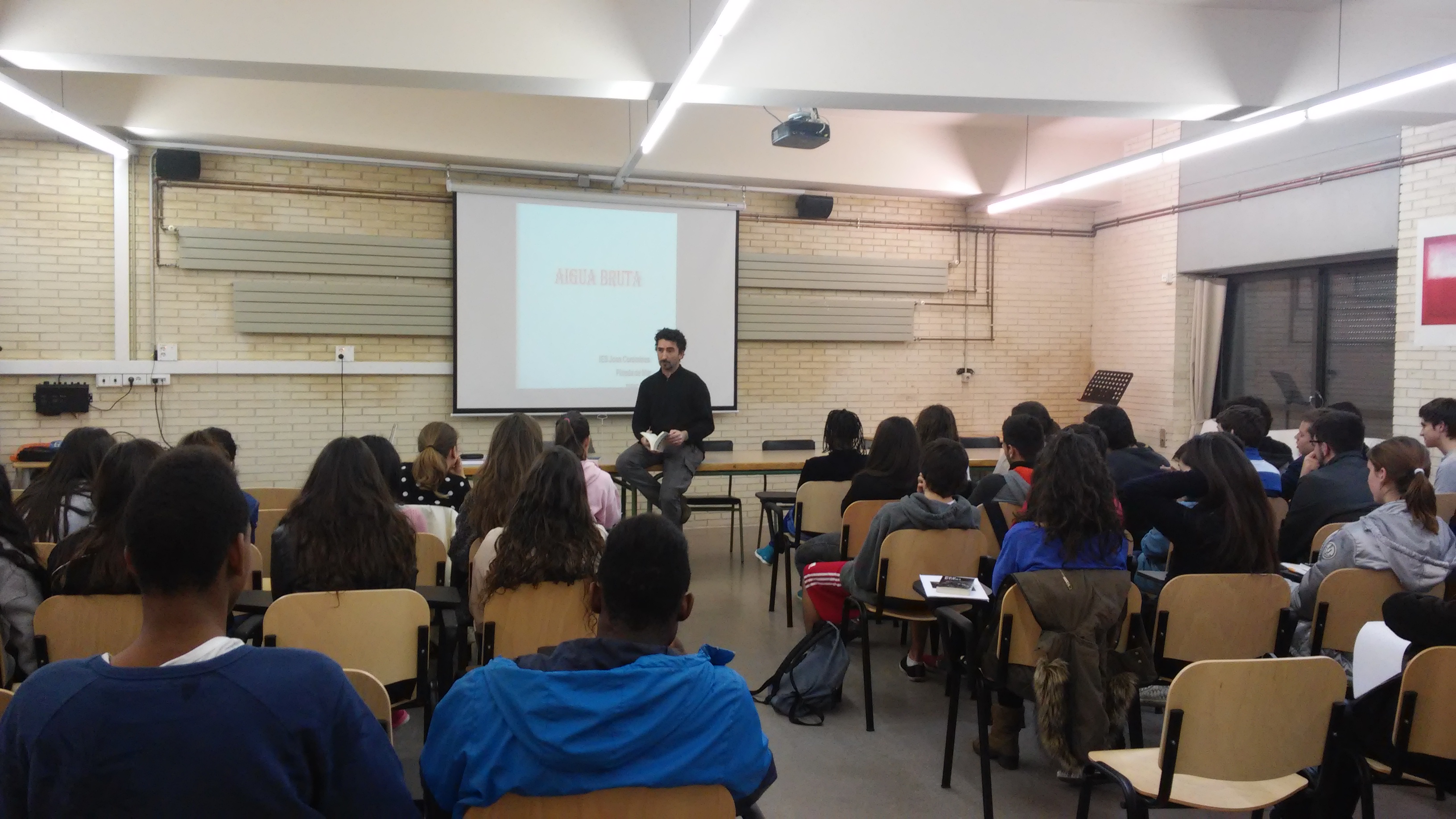 Avui el nostre centre ha estat escenari de dues xerrades singulars. La primera ha estat aquest matí i l’escriptor Pau Vidal ha parlat del seu llibre, Aigua bruta, però sobretot ha parlat de paraules, paraules que es moren i paraules que el llenguatge apressat de la vida quotidiana sovint entela. L’escenari de l’institut, anomenat com el lingüista Joan Coromines, ha obert el tema perquè l’escriptor introduís els alumnes en el món de l’etimologia de les paraules. Així, els alumnes de 1r de Batxillerat han esbrinat l’origen del mot Coromines, relacionat amb el conreu de la terra. En Pau Vidal sobretot s’ha definit com a filòleg i enamorat de les paraules.