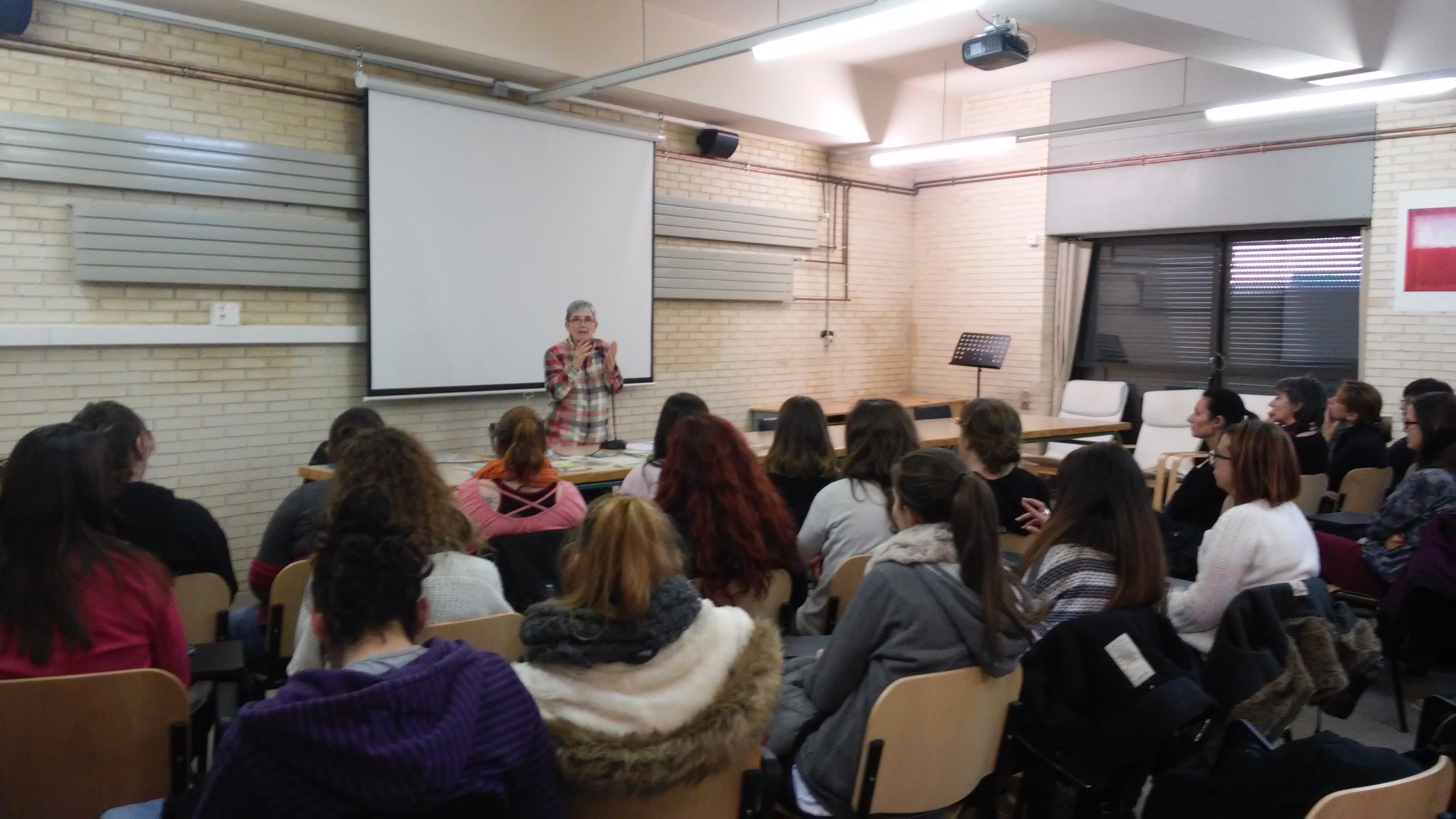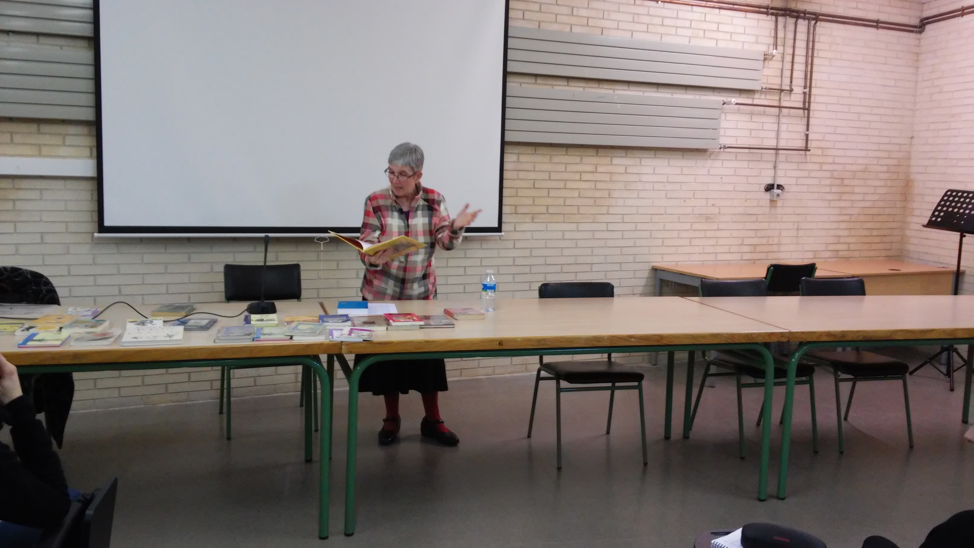 La segona xerrada, per la tarda, ha estat protagonitzada per la mestra i escriptora de literatura infantil Lola Casas i ha estat adreçada a l’alumnat de TEI i als mestres i professorat en general. Els alumnes de TEI han buscat informació sobre l’escriptora i han penjat un mural a la Sala.