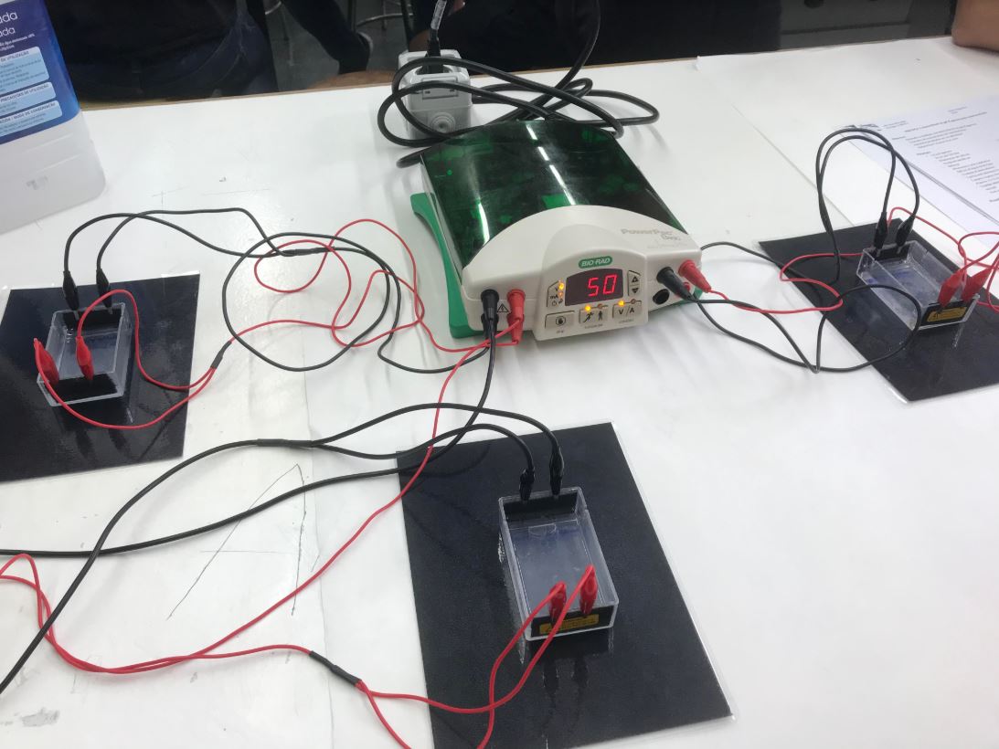La setmana passada, els alumnes de 1r de Batxillerat de Biologia vam poder realitzar una electroforesi en gel d’agarosa amb ADN (tècnica bioquímica molt utilitzada en recerca i diagnòstic biomèdics).