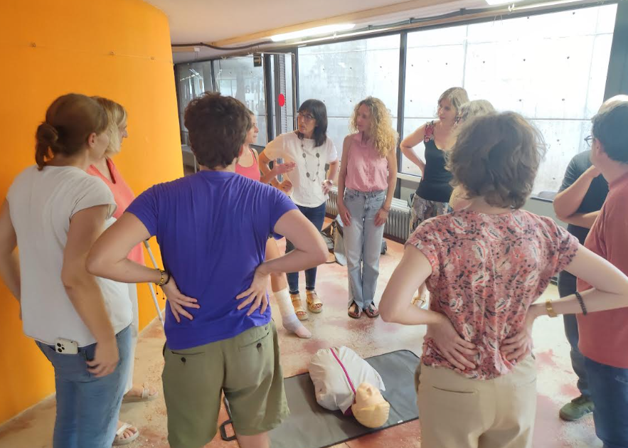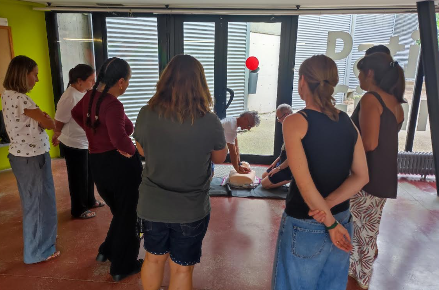 Enguany tota la comunitat educativa del centre (docents, conserges, administratives, educadors) han rebut un tastet de Suport Vital Bàsic a l’inici de curs. L’activitat s’ha organitzat en sessions de dues hores i s’ha dividit a l’equip educatiu en dos grups per rebre nocions bàsiques de com actuar en situacions de risc vital d’una persona (aturada cardíaca, ofegament, inconsciència…)