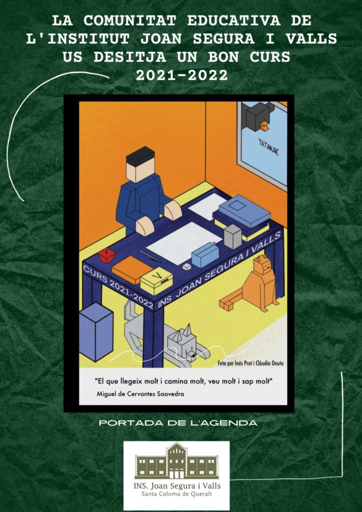 La comunitat educativa de l’Institut Joan Segura i Valls us desitja un Bon Curs 2021-2022! A la imatge hi veureu la portada de l’agenda d’aquest curs, dissenyada i realitzada per les alumnes Inés Prat i Clàudia Onutu durant el curs passat. Esperem que us agradi!