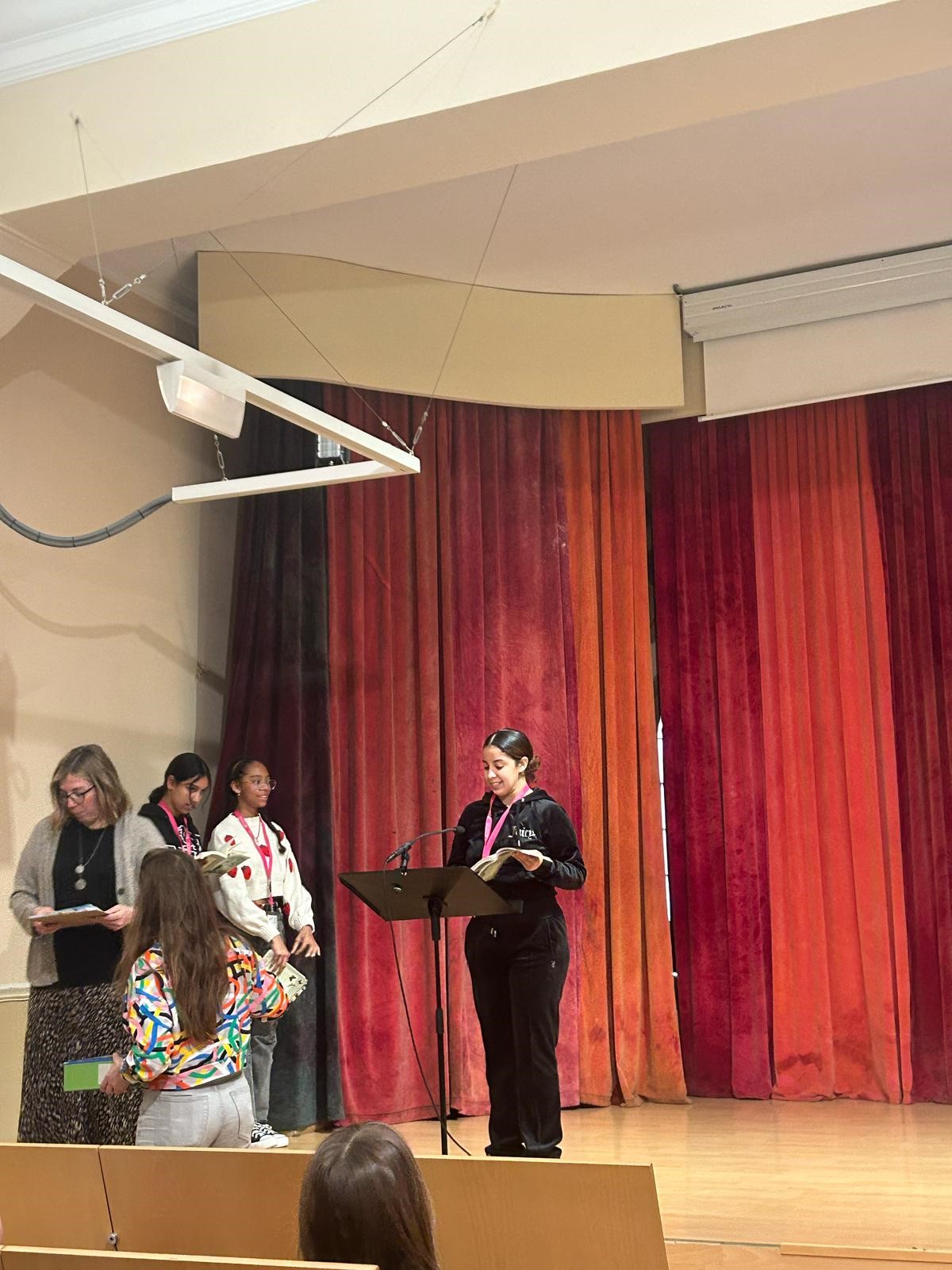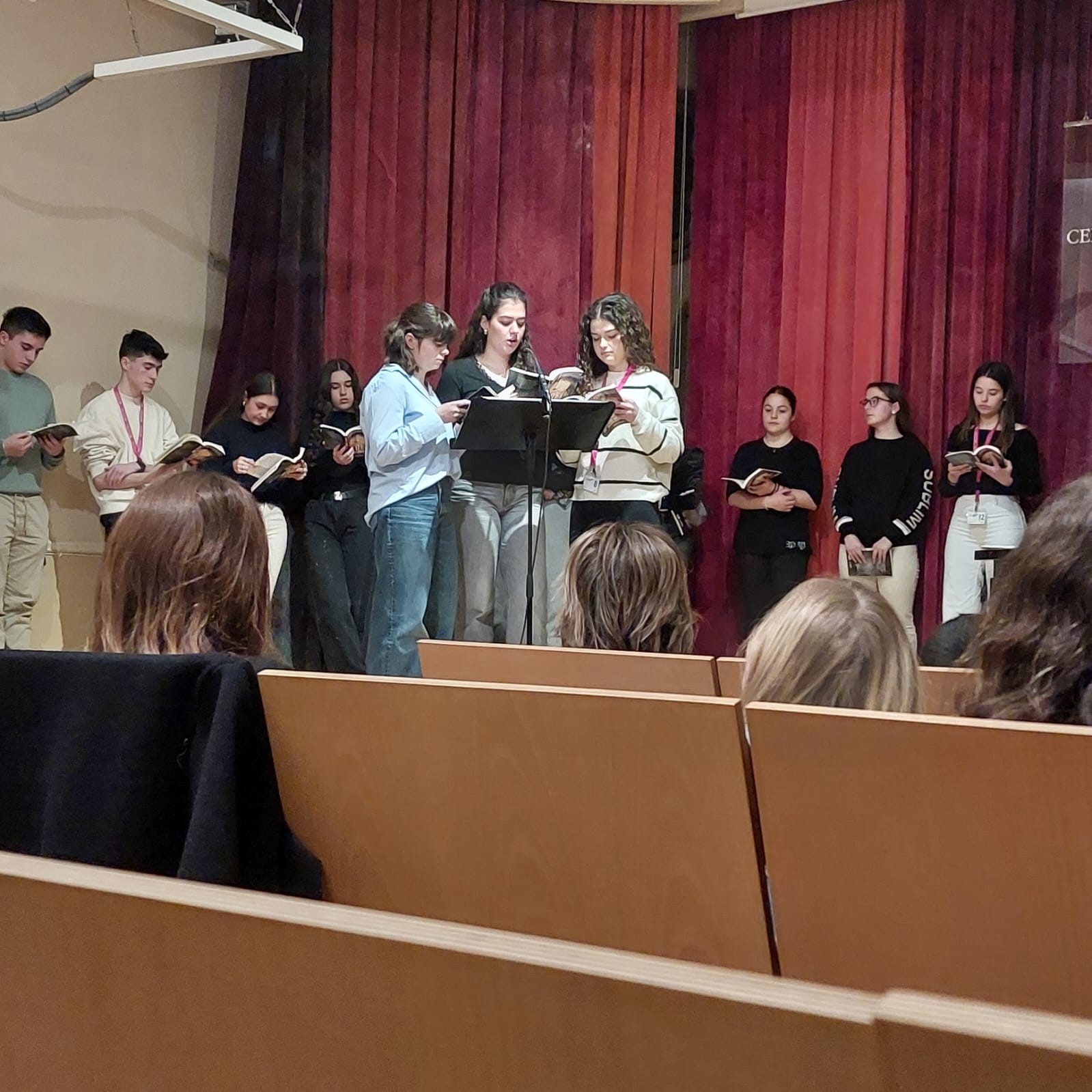 Els representants del centre van ser la Clara, de 2n d’ESO, la Malak, com a alumna de l’aula d’acollida, i tres noies de 4t d’ESO: la Clàudia, la Sira i la Laia. Totes van fer una gran actuació, transmetent emoció i expressivitat en les seves lectures.