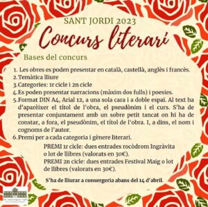 Concurs de Sant Jordi de creació literària Feu un comentari / Per David Melero / 05/04/2023 / General El departament de llengües convoca un nou concurs de Sant Jordi de creació literària.