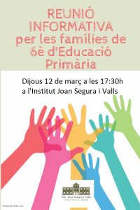 Famílies de 6è, us esperem dijous a l’Institut! Feu un comentari / Per David Melero / 06/03/2020 / General Dijous vinent celebrarem una reunió per tal d’explicar el nostre funcionament i les instal·lacions del centre a les famílies dels alumnes que enguany cursen sisè de primària. Us esperem!