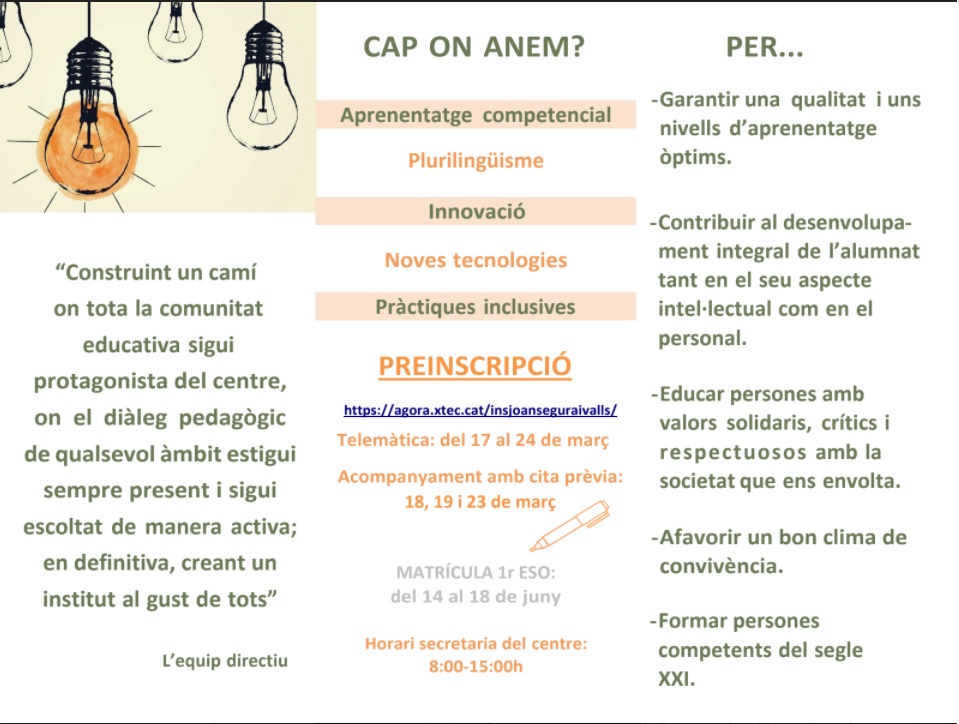 Aquest és el cartell informatiu de la jornada de portes obertes que l’institut us oferirà properament. Hi trobareu també els links per fer la cita prèvia a les sessions presencials de grup (un membre per família) i a l’atenció  personalitzada familiar.