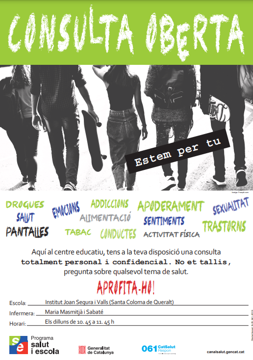 Es concreta amb la intervenció d’una infermera del CAP de Santa Coloma – la Maria Masmitjà – que d’una banda, i conjuntament amb l’orientador, pot programar algunes xerrades adreçades als alumnes; i, d’altra banda, atén les consultes dels alumnes els dilluns de les 10:45 a les 11:45, sempre que pugui venir. La nostra agent de salut també ha iniciat un servei als joves que s’anomena XatJove, a través del qual -amb prèvia autorització de la família- els nois i noies poden fer consultes i rebran consells personalitzats de professionals de la salut.