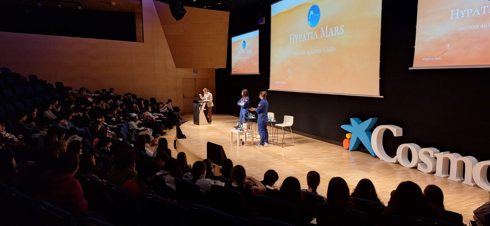 Durant la visita, han pogut experimentar amb diferents aparells que recreen experiments i fenòmens físics diversos i han participat d’una xerrada a càrrec de dues dones científiques que han format part de les missions Hypatia. Ens han explicat en què consisteixen aquestes simulacions, com es preparen i quins reptes han d’afrontar, per tal d’anticipar futurs viatges a Mart.