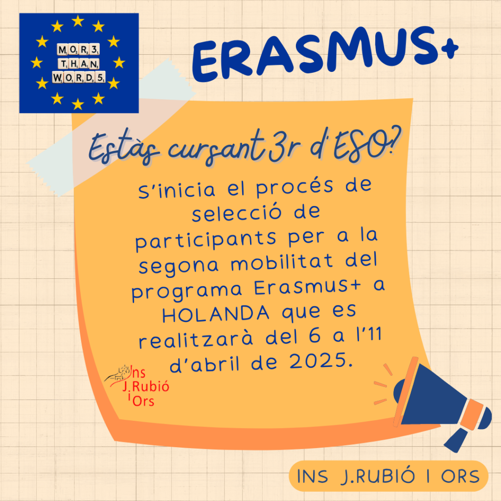S’inicia el procés de selecció de participants per a la segona mobilitat del programa Erasmus+ a Holanda que es realitzarà del 6 a l’11 d’abril de 2025. Si vols participar cal que des del correu @rubioiors contestis al formulari https://forms.gle/gVQ57b9hTUYKSNDbA abans de diumenge 12 de gener confirmant l’assistència a la reunió informativa per a
