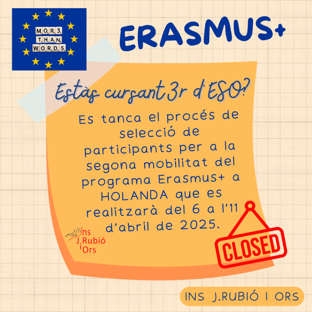 Es dona per finalitzat el procés de selecció de participants per a la mobilitat a Vught, Holanda (del 6 a l’11 d’abril de 2025). Enhorabona a l’alumnat seleccionat i moltes gràcies a tots i totes els que hi heu participat! Us animem a estar atents i atentes a futures mobilitats.