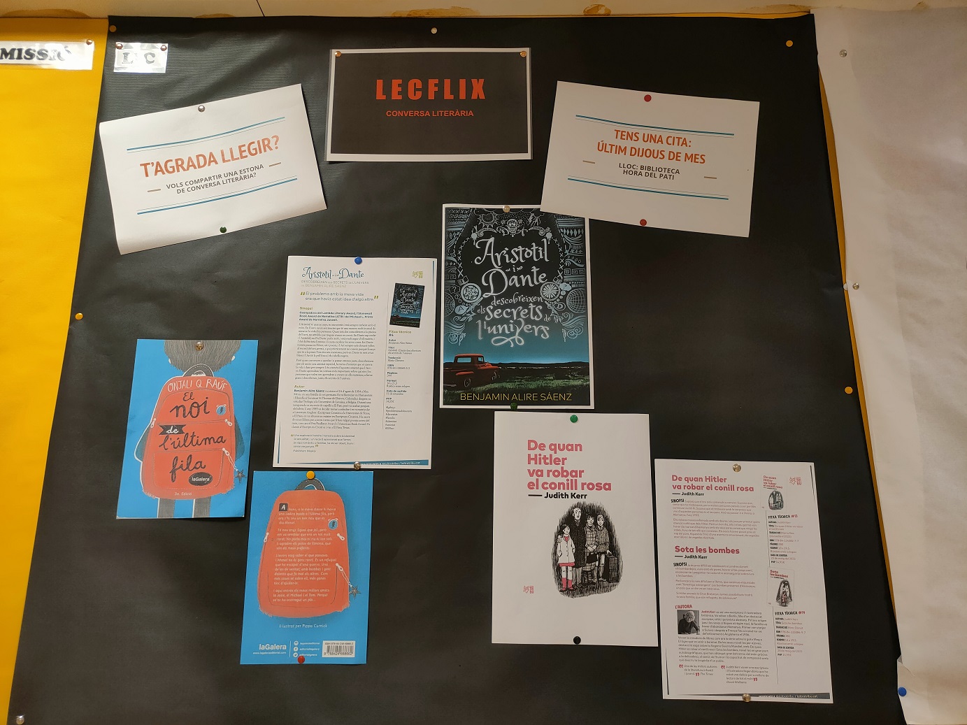 Teniu informació sobre les lectures al suro de la comissió LIC (LECFLIX) del vestíbul. Es farà l’últim dijous de cada mes a la biblioteca, durant l’hora del pati.