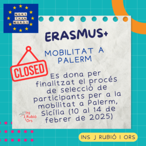 Es dona per finalitzat el procés de selecció de participants per a la mobilitat a Palerm, Sicília (10 al 14 de febrer de 2025). Enhorabona a l’alumnat seleccionat i moltes gràcies a tots i totes els que hi heu participat! Us animem a estar atents i atentes a futures mobilitats.