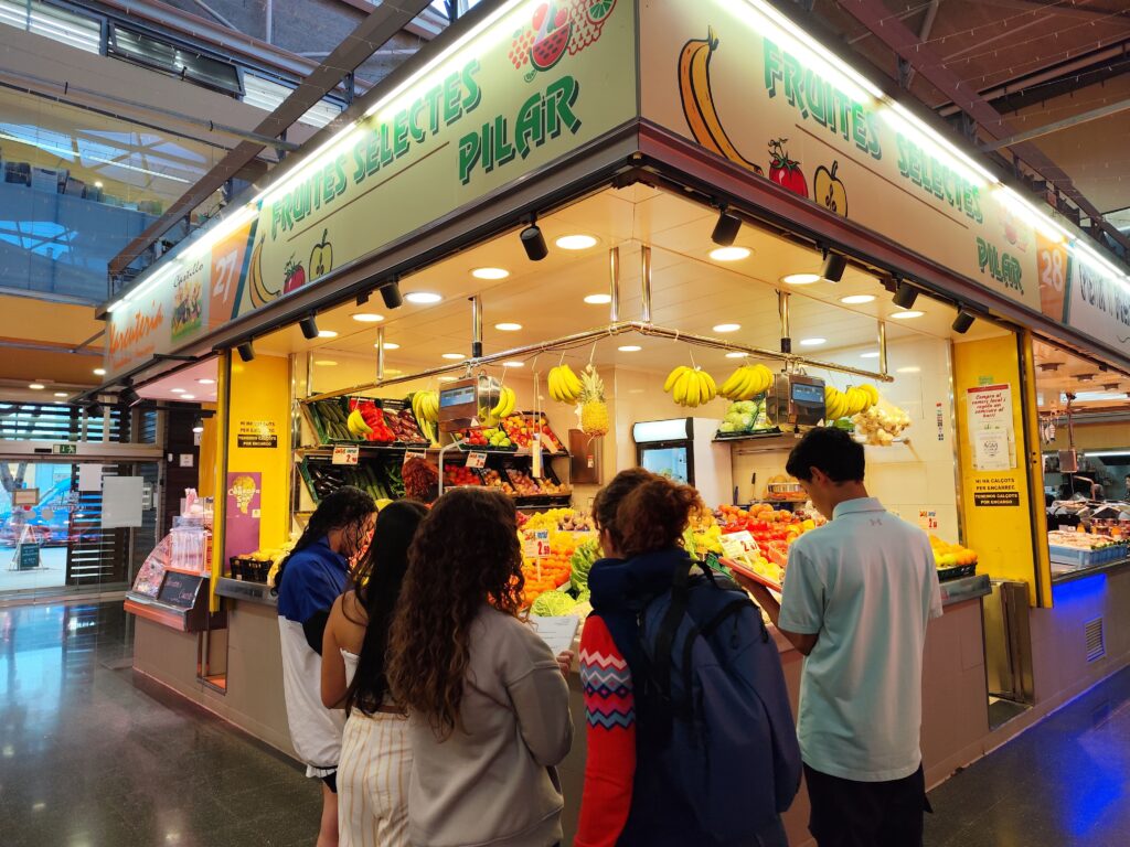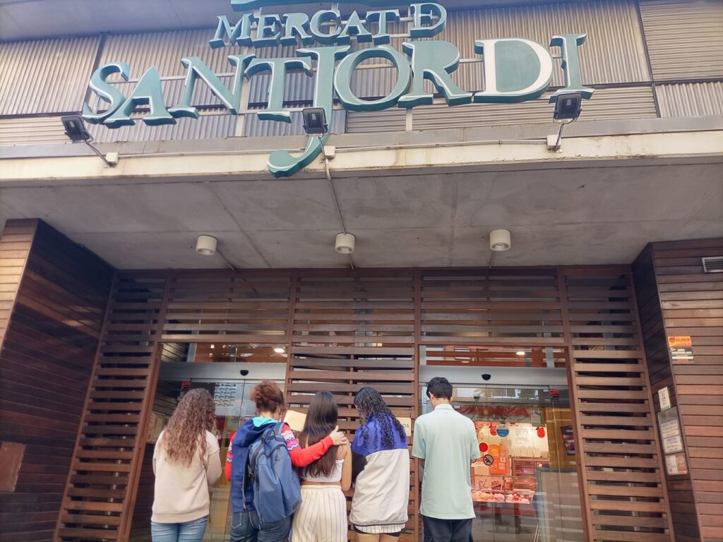 Part de l’alumnat de l’aula d’acollida ha visitat el Mercat de Sant Jordi. De camí han anat revisant els tipus de botigues i allà, han repassat el vocabulari relacionat amb l’alimentació, noms de les parades i practicat una mica el català.