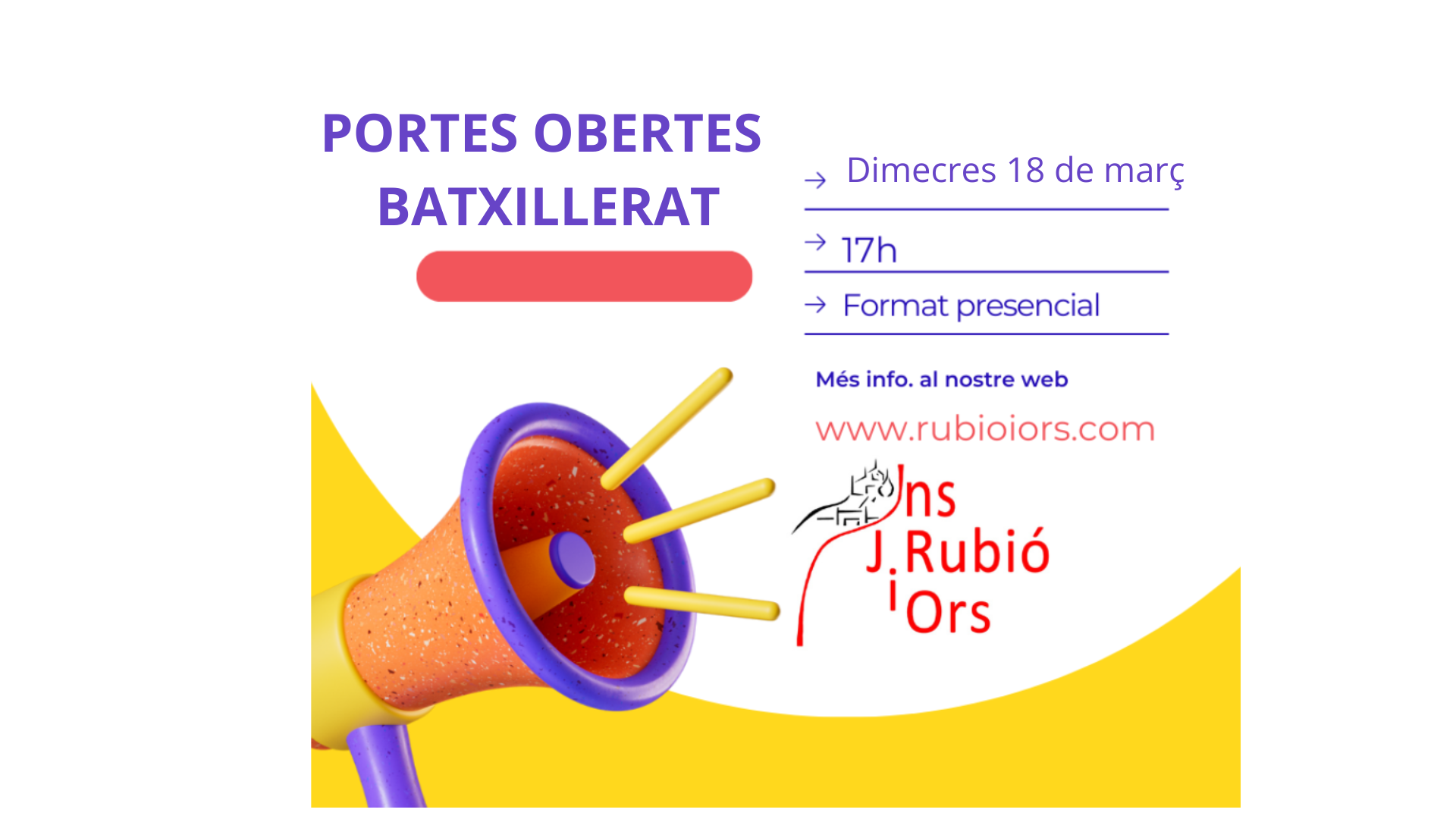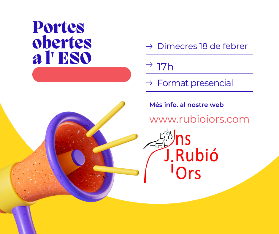Portes obertes INFORMACIÓ VOLS CONÈIXER L’INSTITUT? Et presentem l'institutExperiències DATES PREINSCRIPCIÓ 2026 ESO: del 6 al 18 de març de 2026 BATXILLERAT: del 9 al 16 d’abril de 2026