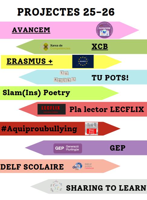 Projectes Vols saber més dels nostres projectes? AVANCEM XCB ERASMUS + TU POTS! SLAM(INS) POETRY PLA LECTOR LECFLIX #Aquiproubullying GEP DELF SCOLAIRE SHARING TO LEARN