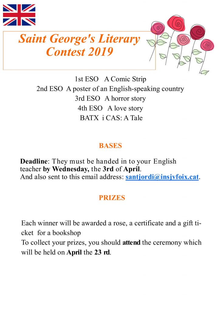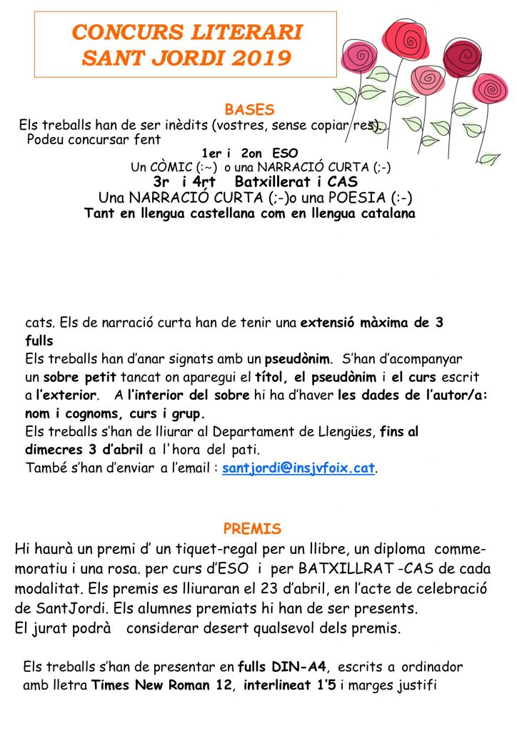 Un any més, des del Departament de Llengües de l’Institut J.V. Foix s’impulsa el Concurs Literari de Sant Jordi. Enguany, es pot participar amb relats inèdits en català, castellà, anglès i francès. Us animem a tots a participar-hi!
