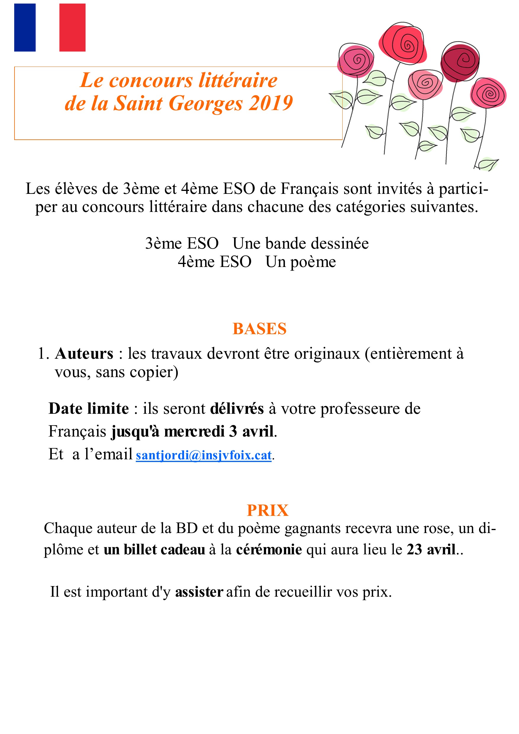 Un any més, des del Departament de Llengües de l’Institut J.V. Foix s’impulsa el Concurs Literari de Sant Jordi. Enguany, es pot participar amb relats inèdits en català, castellà, anglès i francès. Us animem a tots a participar-hi!