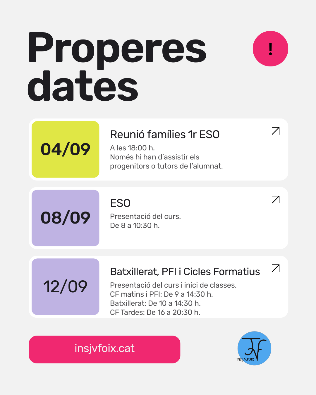 Pròximes dates i inici de curs! Feu un comentari / Per admin / 02/09/2025 / 1r Batxillerat 2n Batxillerat Batxillerat Cicles Formatius Curs 2025-2026 ESO ESO 1 ESO 2 ESO 3 ESO 4 General Portada