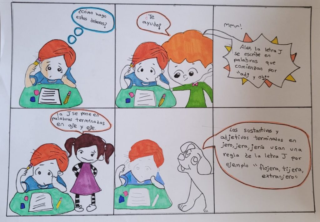 Los alumnos de 1.º de la ESO han estudiado la ortografía mediante la elaboración, en grupos, de un cómic que reflejara el uso correcto de las normas ortográficas. De esta manera, son ellos quienes estudian, en primera persona, las normas y las plasman, a modo de resumen, en unas viñetas que, si echáis un vistazo,