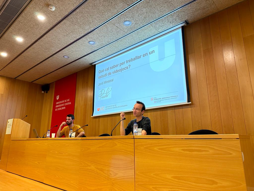 Primer es va fer una ponència a càrrec de Jordi Ministral (cofundador i cap de desenvolupament de Piccolo Studio), amb el títol “Què cal saber per treballar en un estudi de videojocs?”.
