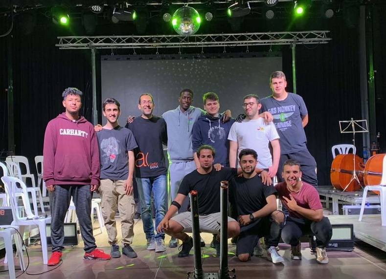 La feina de muntatge va començar ben d’hora ja que a les 8 del vespre tot havia d’estar a punt per les proves de so. Els alumnes havien dedicat les últimes cinc classes a l’institut a simular acústicament l’espai, calcular distàncies, retards i la col·locació exacta dels altaveus. També a tenir clar el material, la configuració i les adreces dels equips de llum i la disposició i l’organització dels micròfons, els monitors i el material de l’escenari.