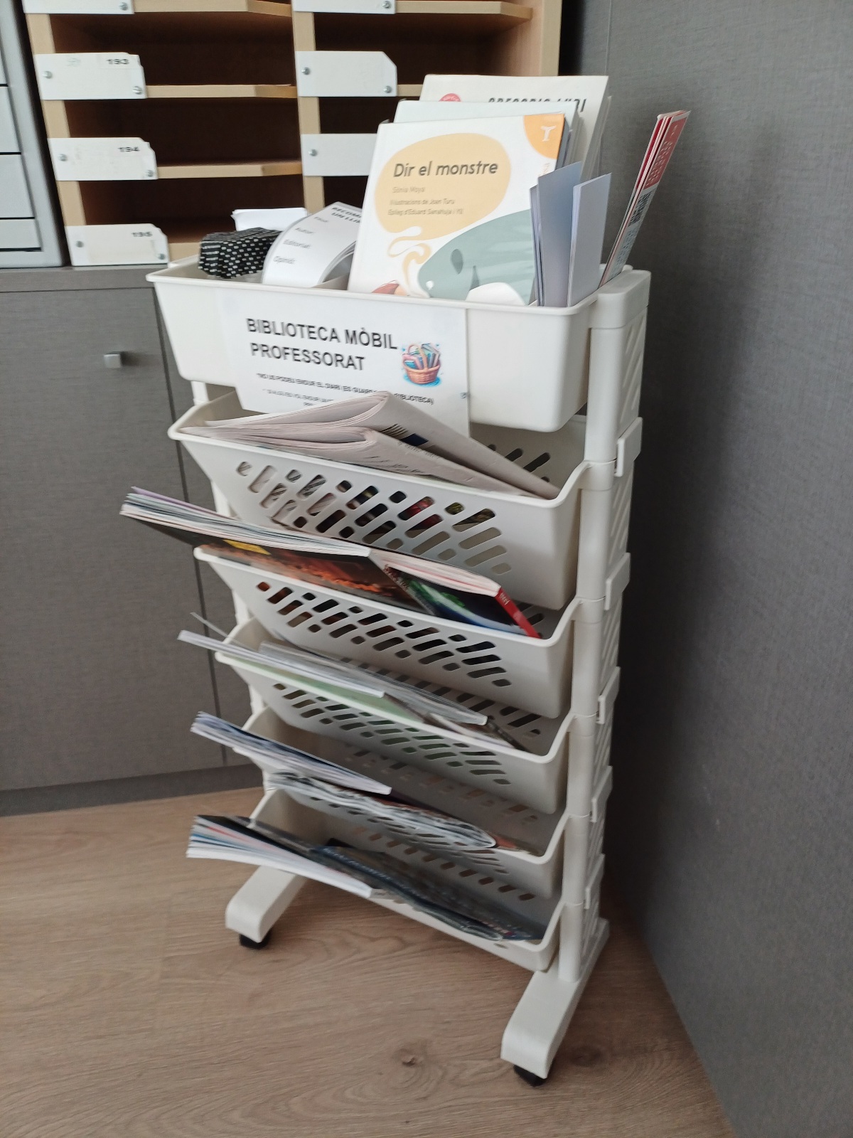 Per celebrar-ho, hem preparat un petit detall: una biblioteca mòbil a la sala de professores i professors, perquè puguin gaudir del nostre fons de revistes, premsa local diària, alguns llibres i un tastet de les iniciatives de la biblioteca, com les recomanacions literàries o el Rebost poètic que vam iniciar el curs passat.