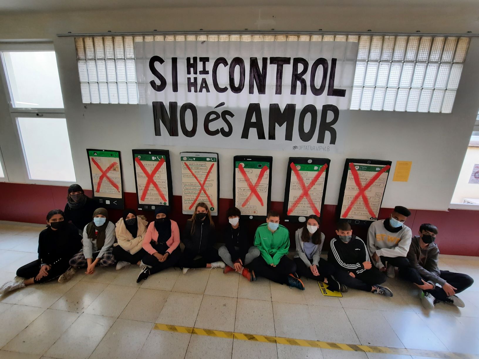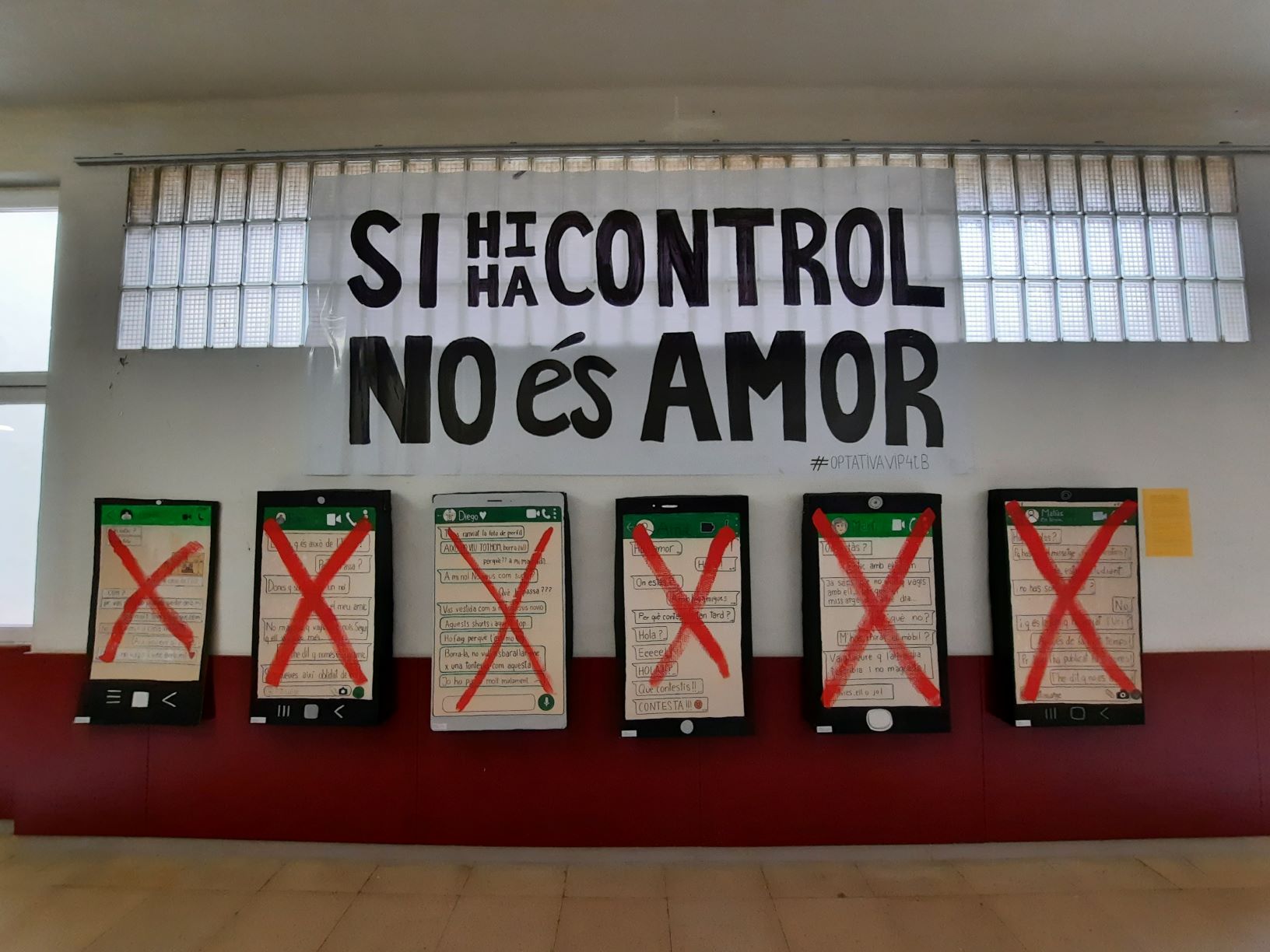 Amb motiu del Dia en Contra la Violència de Gènere, l’alumnat de 4t d’ESO B a l’optativa de Visual i Plàstica, ha estat treballant en el projecte “Si hi ha control no és amor” per denunciar tot tipus de violència tant física com psicològica, i ho ha fet a través d’aquests mòbils gegants. Els trobareu exposats al passadís central de la primera planta.