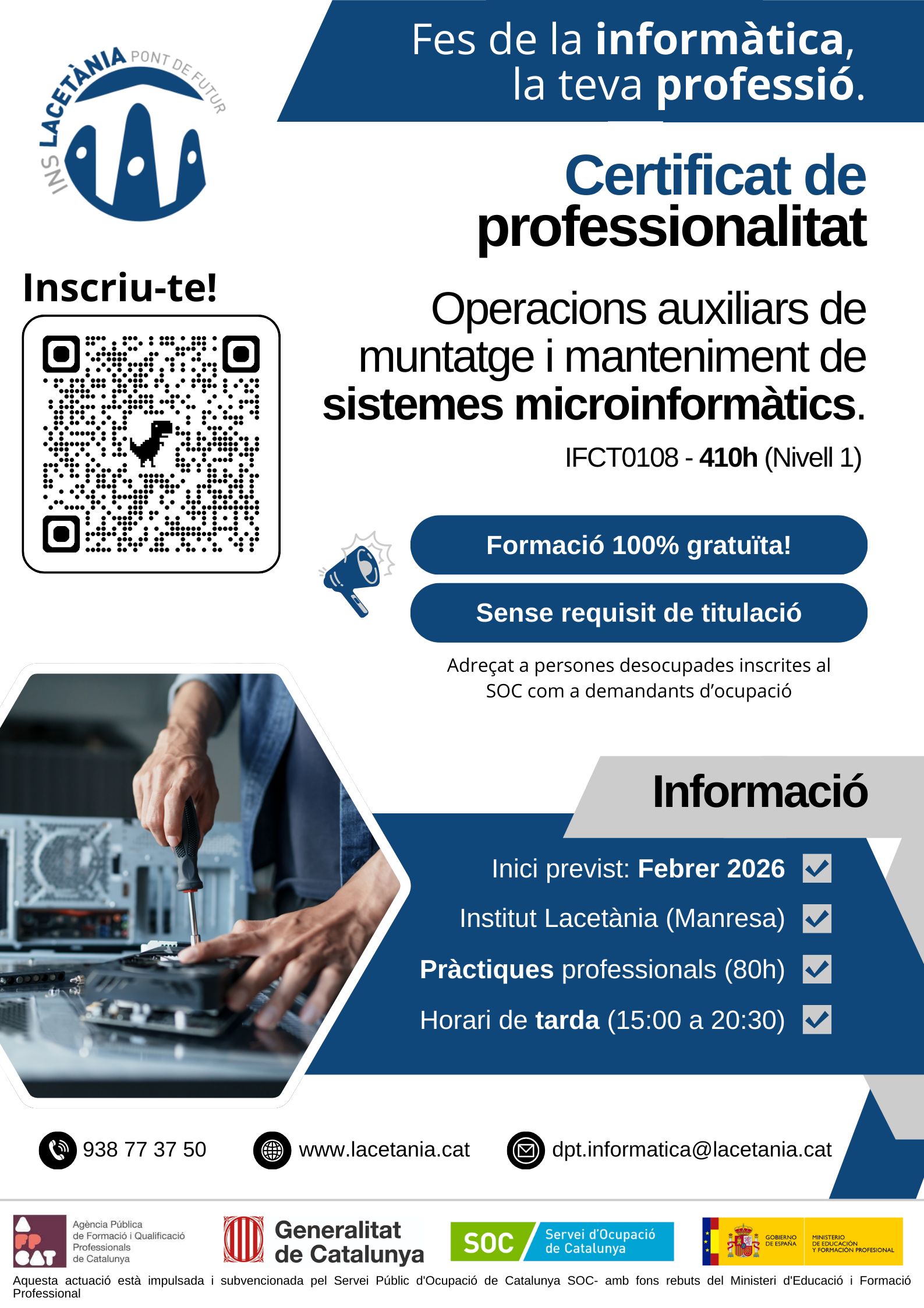 L’Institut Lacetània de Manresa està preparant el nou Certificat de Professionalitat d’Operacions auxiliars de muntatge i manteniment de sistemes microinformàtics, que es preveu iniciar de cara al febrer del 2026. Aquest programa intensiu, amb una durada de 410 hores, està orientat a persones que volen accedir a l’àmbit de la informàtica i el suport tècnic.