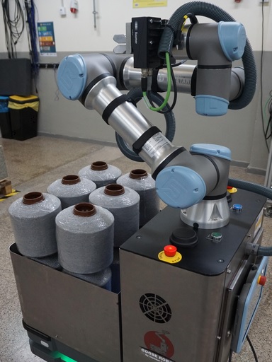 El robot AMR treballa autònomament per recollir producte de la zona de recepció de matèria primera ajudant-se de tecnologia de visió artificial i el braç col·laboratiu que duu incorporat. El sistema pot transportar fins a 12 cons per viatge fins la línia de producció, i posicionar cada con de fil en un puell de la filera.