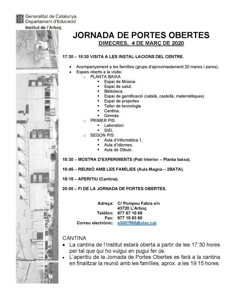 El dimecres 4 de març, a partir de les 17:30 hores, hem OBERT l’Institut de l’Arboç per fer la Jornada de Portes Obertes. L’objectiu és el de facilitar a les famílies i al futur alumnat tota la informació que els pugui interessar. En aquest marc s’ha pogut visitar i conèixer el projecte pedagògic de l’Institut: veure els taller tecnològics i el seu funcionament, el laboratoris científics, diverses aules específiques (dibuix, música, idiomes, informàtica, SIEI…) i els diversos espais d’aprenentatge ubicats al pati central.