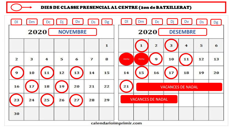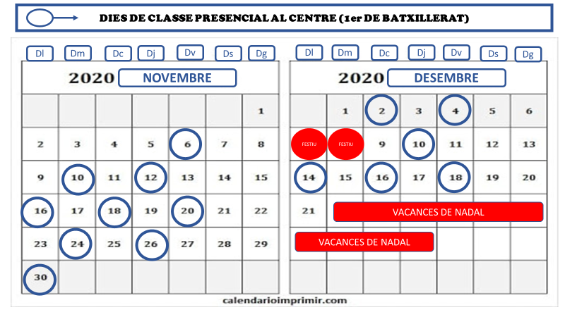 - 1r de batxillerat. Model híbrid de dies alterns (50% de presencialitat). Veure el detall en el calendari que hi ha tot seguit.