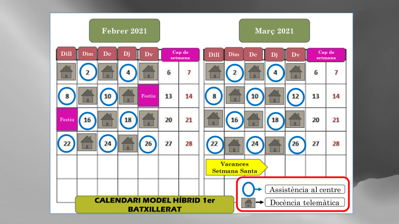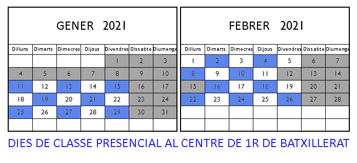 A partir del dilluns 11 de gener de 2021 continua el model híbrid d’ensenyament a Batxillerat. Tot seguit disposeu del detall: