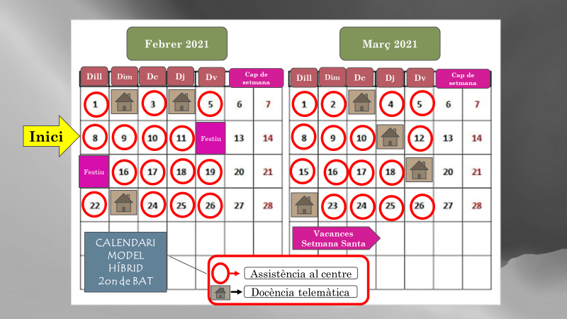 - 2n de batxillerat passa a fer el model híbrid 4+1 rotatori (80% de presencialitat). Veure el detall en el calendari que hi ha tot seguit. Aprovat pel Consell Escolar en data 03.02.2021 i autoritzat pels Serveis Territorials d’Educació a Tarragona en data 06.02.2021.