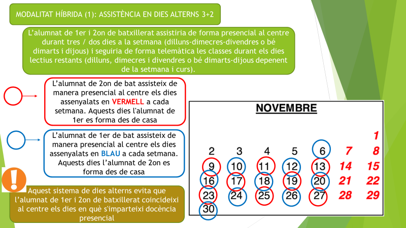 - 1r de batxillerat. Model híbrid de dies alterns (50% de presencialitat). Veure el detall en el calendari que hi ha tot seguit.