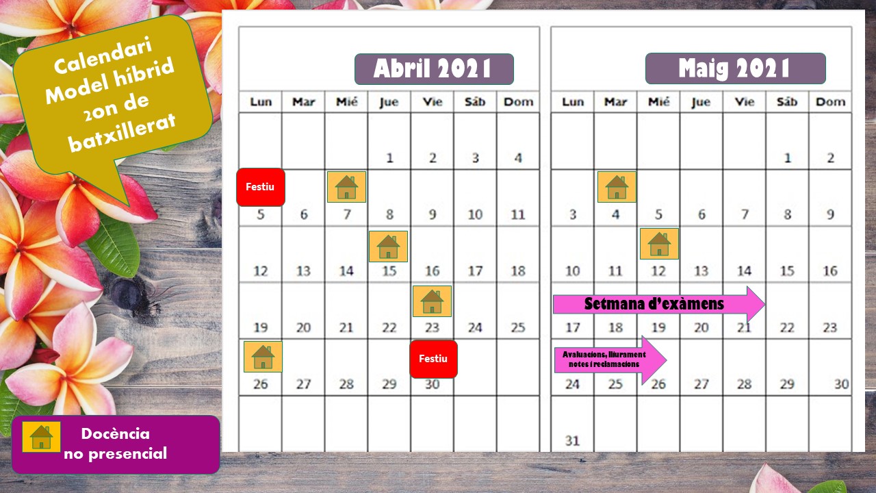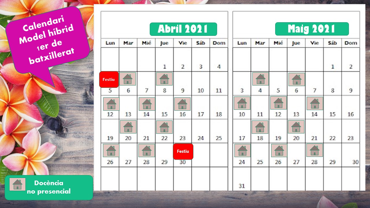 - 1r de batxillerat continua amb el model híbrid de dies alterns (50% de presencialitat). Veure el detall en el calendari que també hi ha tot seguit i que és una continuació del que ja s’està realitzant.