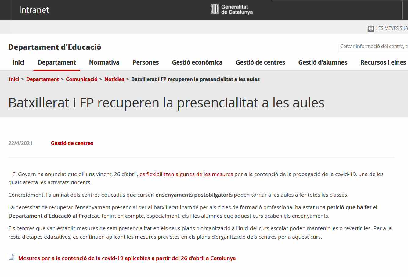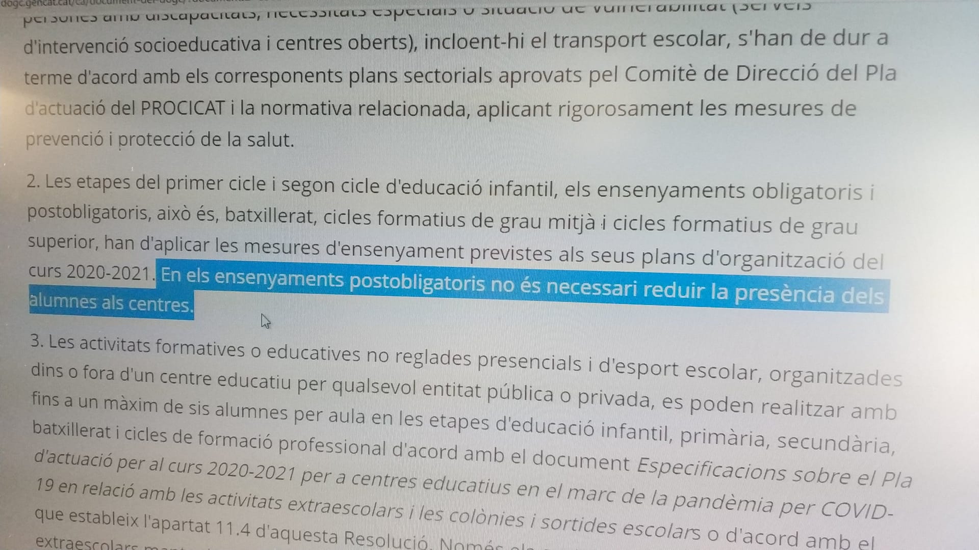 A conseqüència de la Resolució de la consellera de Salut i del conseller d’Interior, per la qual es publiquen noves mesures en matèria de salut pública per a la contenció del brot epidèmic de la pandèmia de covid-19, els ensenyaments postobligatoris, en particular el batxillerat, ha de reduir la seva presencialitat.