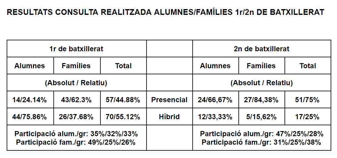 A partir del dilluns 11 de gener de 2021 continua el model híbrid d’ensenyament a Batxillerat. Tot seguit disposeu del detall: