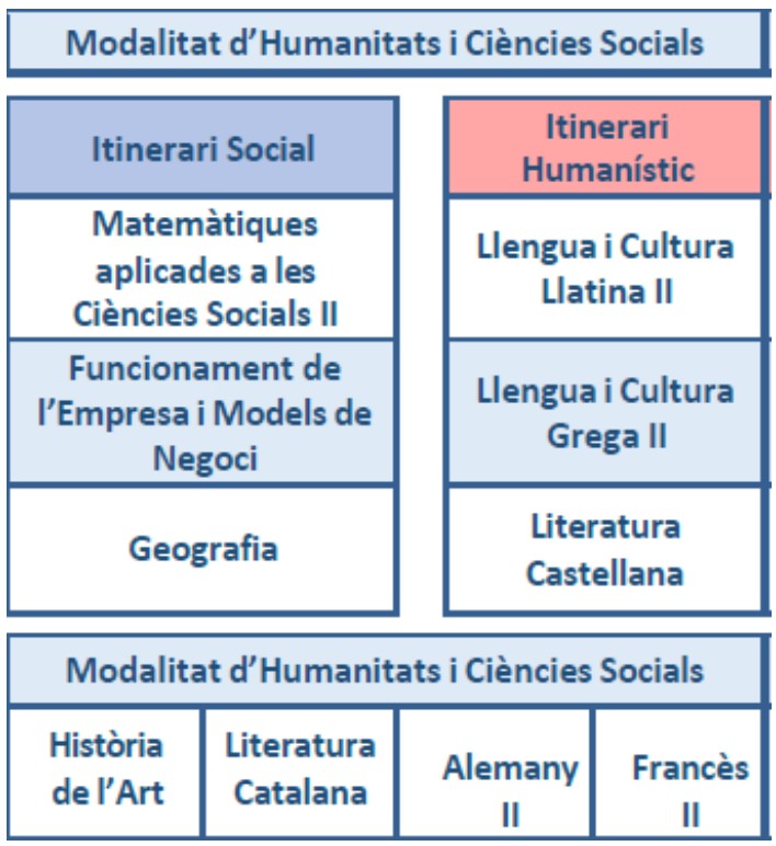 • Els/les estudiants que escullin fer el batxillerat en la modalitat d’Humanitats i Ciències Socials cursaran obligatòriament la matèria de Llatí o de Matemàtiques Aplicades a les Ciències Socials (depenent de l’itinerari triat) a 2n curs de batxillerat