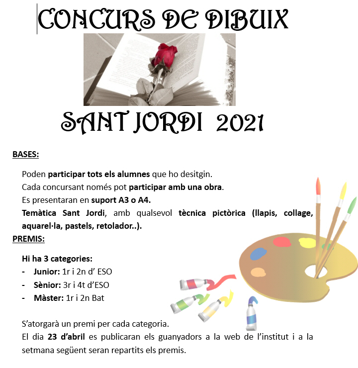Concurs de dibuix Sant Jordi 2021 admin23/04/21 BASES DEL CONCURS DE DIBUIX PREMIATS EN EL CONCURS DE DIBUIX DIBUIXOS GUANYADORS DEL CONCURS DE DIBUIX