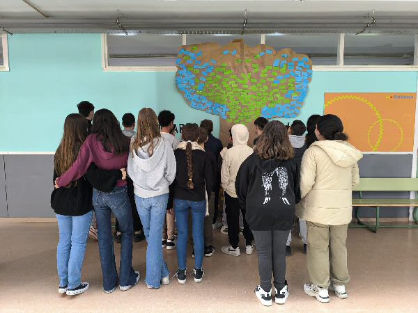 L’activitat principal va consistir en la creació de “L’arbre de la pau”, un mural col·laboratiu on cada estudiant va aportar el seu gra de sorra amb tres post-its de diferents colors: groc per identificar accions o valors que trenquen la pau, verd per destacar accions que la promouen, i blau per expressar desitjos o compromisos personals. Els post-its es van col·locar estratègicament: els grocs a les arrels, els verds a les branques i els blaus a les fulles, simbolitzant com els valors de pau creixen i es desenvolupen a partir de reflexions personals.