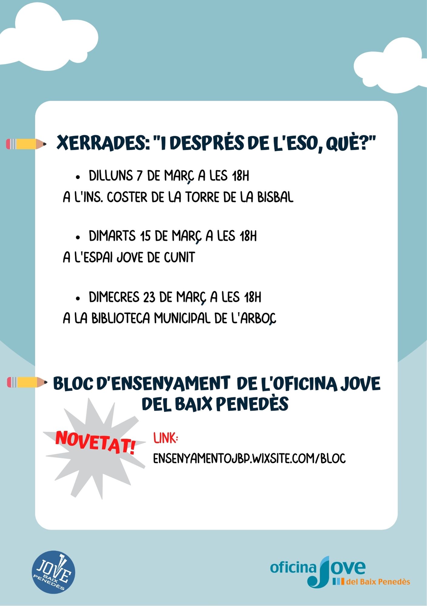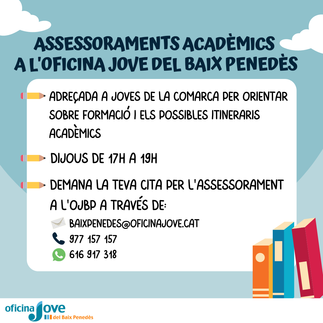 Les xerrades presencials són obertes a pares i joves de 3r i 4t d’ESO de tota la comarca del Baix Penedès. I la ponència anirà a càrrec de les tècniques de l’Oficina Jove del Baix Penedès.