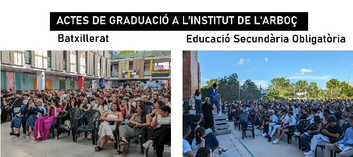 La setmana de graduacions a l’Institut de l’Arboç ha estat un moment memorable per a tota la comunitat educativa. El dia 25 de juny, l’alumnat de 4t d’ESO va celebrar la seva graduació en un acte emotiu que va tenir lloc al pati de l’institut. L’esdeveniment va començar a les 18:00 hores i va ser presidit pel director del centre. A més, diversos membres del professorat, principalment els tutors/es, van dirigir unes paraules a les graduades i els graduats. També van intervenir familiars i alumnat, que van oferir discursos plens d’emoció i gratitud. La cerimònia es va tancar amb el lliurament dels diplomes corresponents, reconeixent l’esforç i dedicació dels nostres estudiants durant aquests anys de secundària.