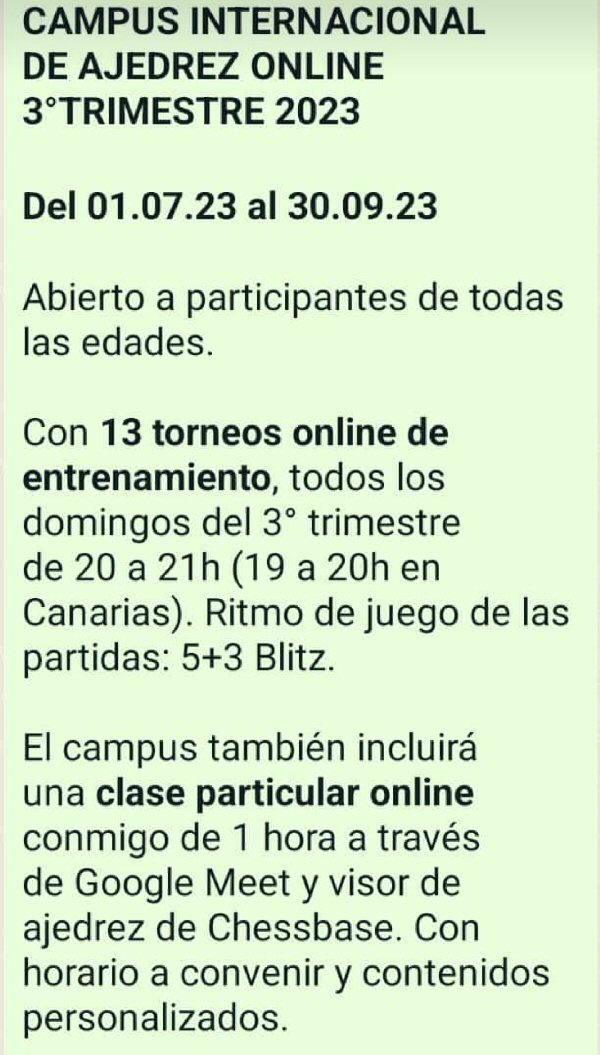 - Obertes les inscripcions al Campus Online +Info per WhatsApp al mòbil del mestre d’escacs organitzador Richard Guerrero: +34 651175111.