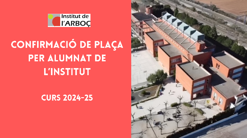 Els alumnes que l’actual curs 2023-2024 estan matriculats a l’Institut de l’Arboç han de CONFIRMAR PLAÇA si volen el proper curs 2024-2025 seguir en el centre. Les places no reservades sortiran a la Preinscripció per a l’alumnat nou que les sol·liciti.