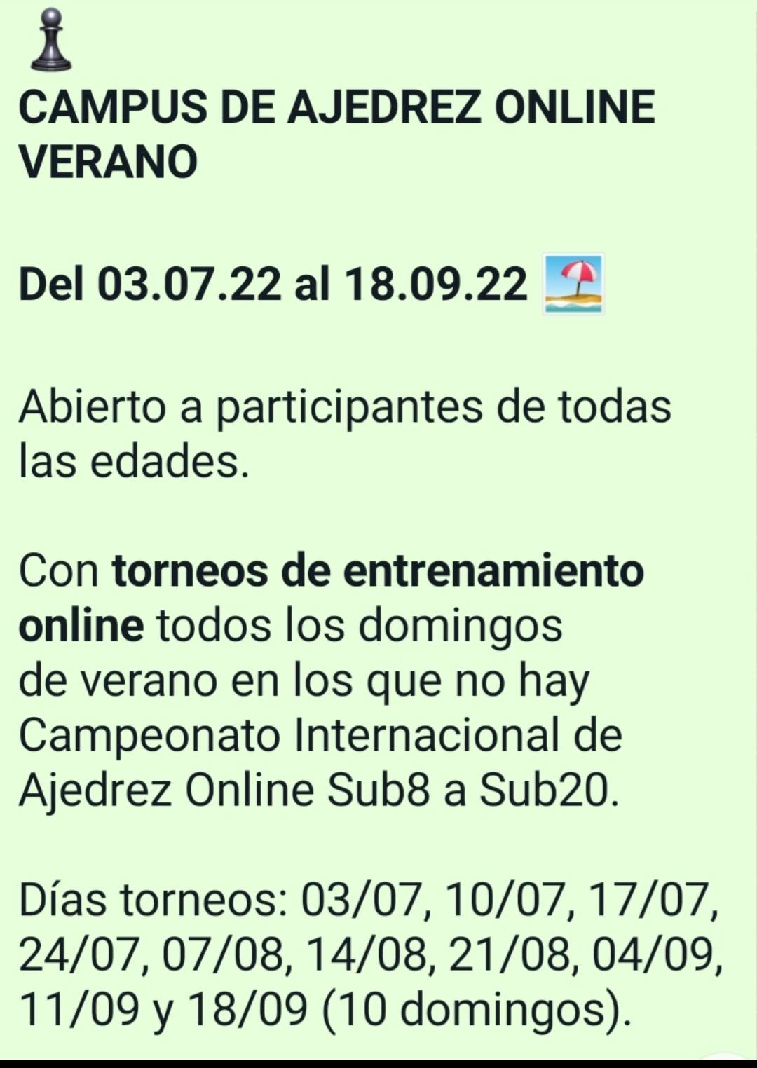 - Amb “tornejos d’entrenament online” tots els diumenges d’estiu en els que no hi hagi Campionat Internacional d’Escacs Online Sub8 a Sub20.