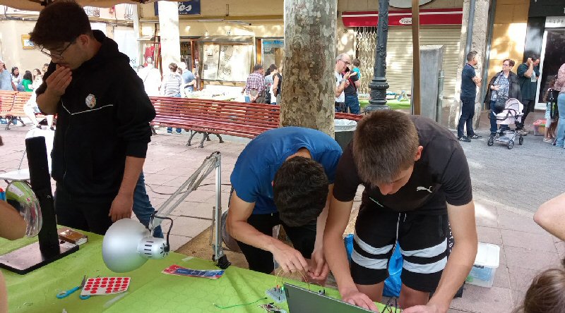 Enguany el nostre Institut va desplaçar-hi un grup d’11 alumnes que acompanyats per alguns professors del centre van gaudir i fer gaudir a tots els assistents divulgant els experiments i projectes que havien treballat a l’aula. En concret, la Farah, la Daniela, l’Ibrahim i l’Adrià (alumnat de 1r BAT) i la Marina, la Marta i la Carla (estudiants de 4t d’ESO) van presentar el treball preparat i anomenat: “Emmiralla’t amb la ciència” a través del qual van explicar les propietats de la reflexió, la inversió anterior-posterior que fan els miralls plans i com construir una cuina solar amb un mirall parabòlic. Al mateix temps els alumnes Marc, Jordi, Hel·lena i Judith (que també cursen 4t d’ESO) van il·lustrar dos treballs de l’àmbit tecnològic: un era un cotxe controlat amb portes lògiques i sensors i l’altre consistia en una maqueta del centre que contemplava millores per ajudar a alumnes amb problemes auditius i de mobilitat, per una banda, i per altra millores energètiques i de confort.