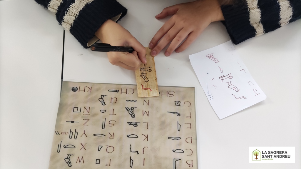 Para empezar, nos dieron un papel con la traducción de nuestro alfabeto al jeroglífico y tuvimos que escribir nuestro nombre. Cuando acabamos, cogimos un trozo de papiro para escribir otra vez nuestro nombre. Ya con nuestros nombres escritos, hicimos un círculo en el suelo y empezamos a hablar de la momificación.