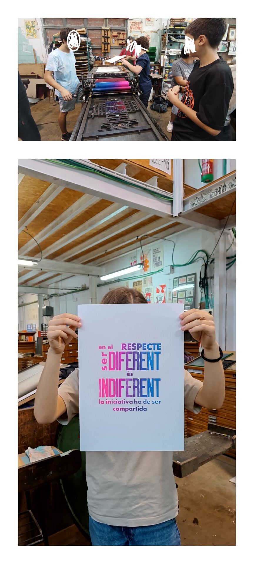 models de fanzins i com funciona una impremta antiga. Amb aquesta impremta vam imprimir uns cartells amb una frase que prèviament havíem escrit a classe. Com que vam anar en dos grups diferents, vam imprimir els cartells amb dues combinacions de colors diferents i el següent dia de classe vam fer la composició que podeu observar a la foto.